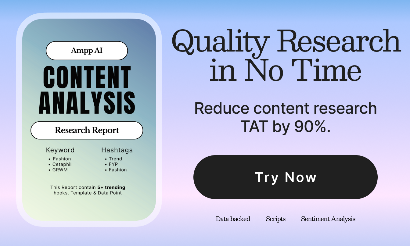Enter your brief, let AMPP rank the most relevant Instagram content, and get a ready‑to‑use report packed with performance stats, hooks, scripts, and creator profiles.